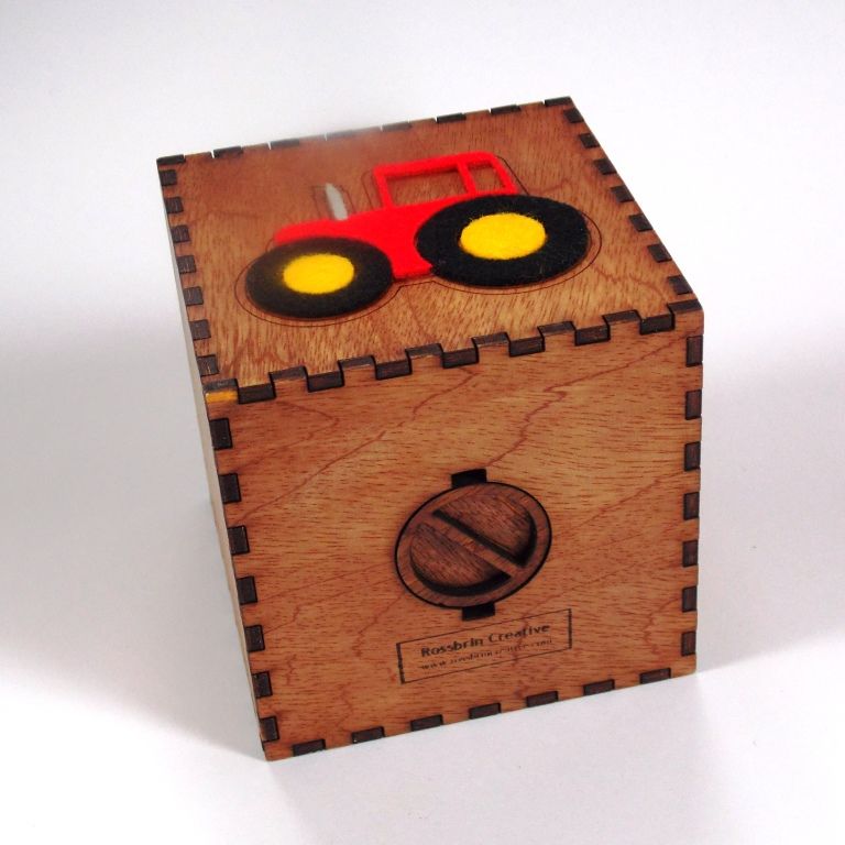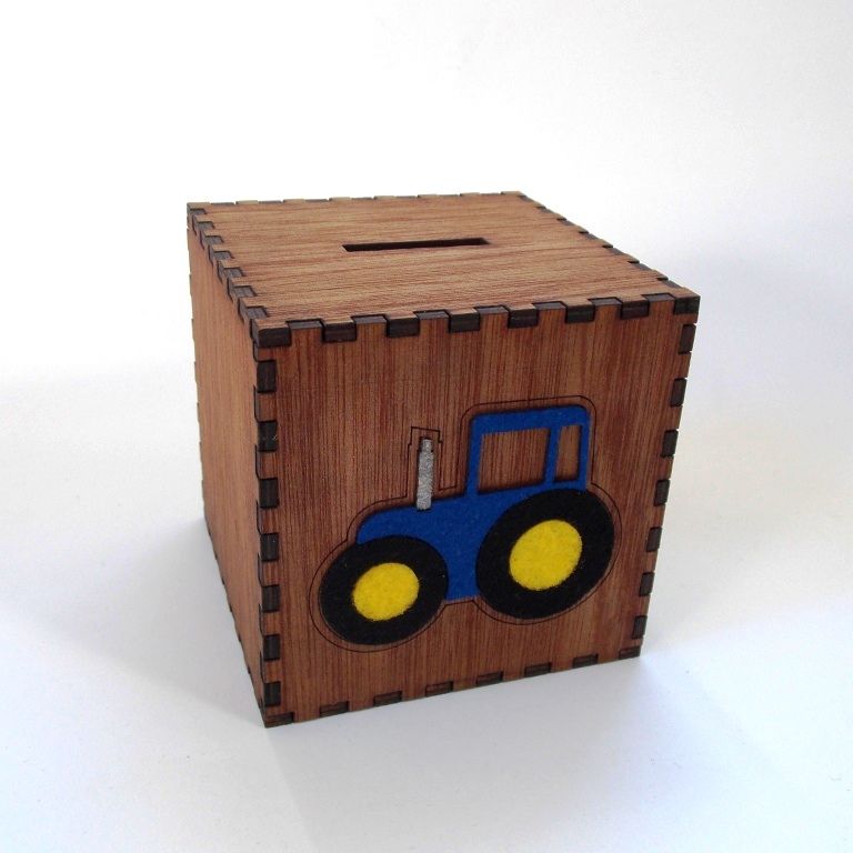 Cute child's money box, available in a 5 colours. This piece is made in a stained wood finish and embellished with a felt finish tractor motif. The box can be opened from underneath to access the contents.
